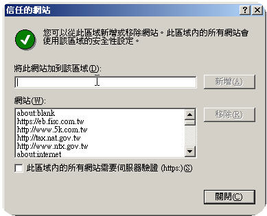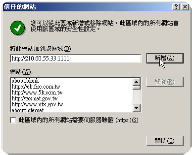 5. After the "Trusted sites" window is opened, enter URL of the course registration system in the "Add this website to the zone" textbox, the URL is shown to the right: http://210.60.55.33:1111. |