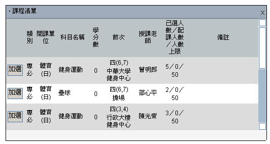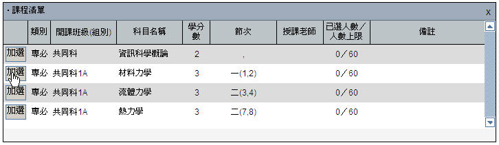 In windows of course lists in "Class/department course list", "Course inquiry window", etc., there is an "Add" button to the left of each course, click this button and the system will determine if you can add this course, and display a message to let you know if the course has been added.