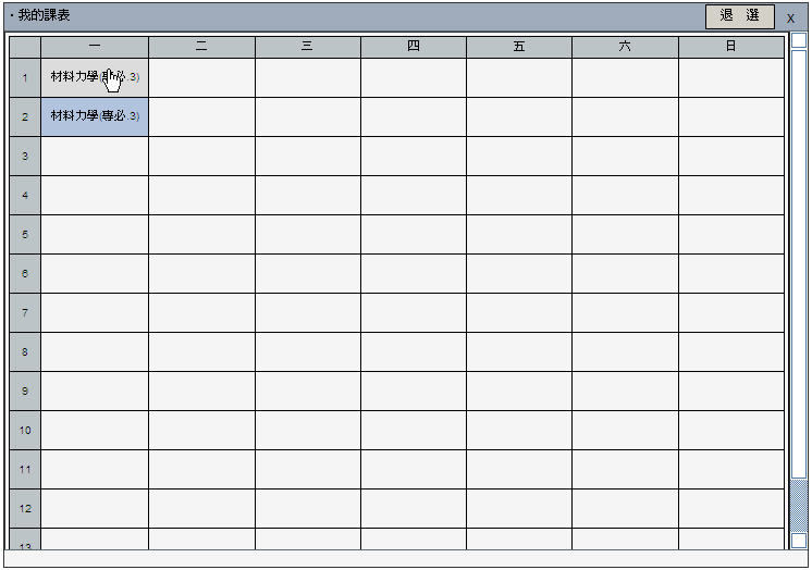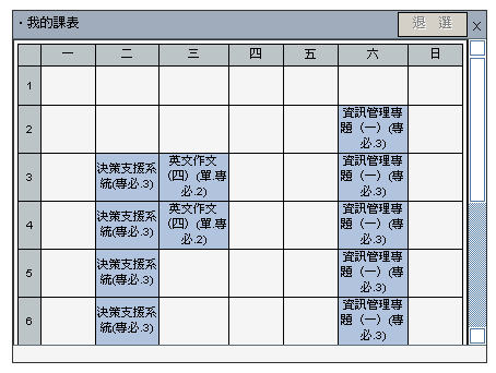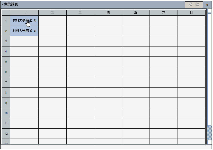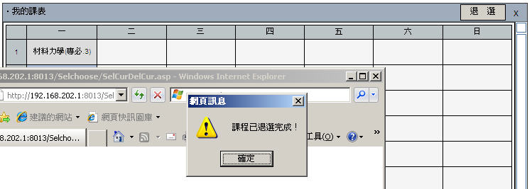 In the small course schedule at the center or the lower-left corner of "My schedule" window, click the course you wish to drop, then click the "Drop" button, the system will check all conditions and display a success message when the drop request has been processed successfully; otherwise, the system will display reasons why the drop request can't be processed.